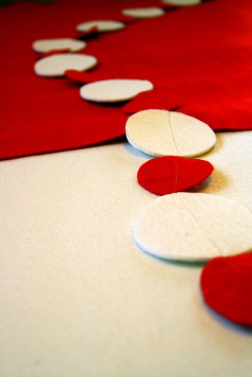 Our theme this year is definitely red and white. We will do our whole tree in just those two colours. We went to the fabric shop and purchased some felt and this was our first project. A simple garland using silver thread. After we made this one I saw one of my twin daughters cutting up some tiny hearts. She said she was making a heart garland for her twin sister to show her how much she loves her. Seriously! I almost melted on the spot.