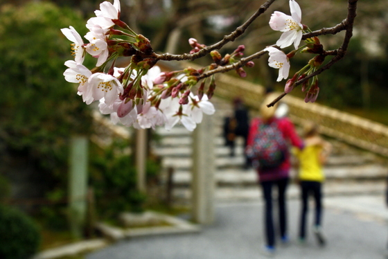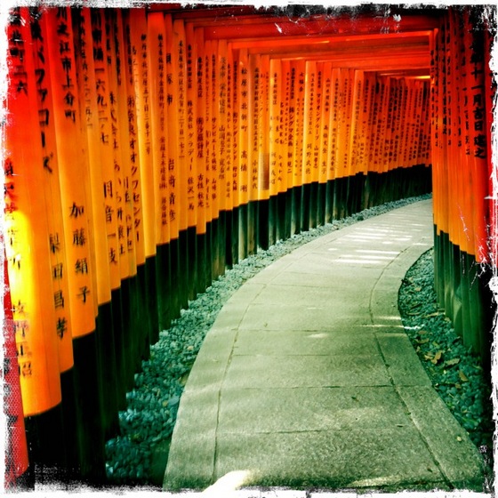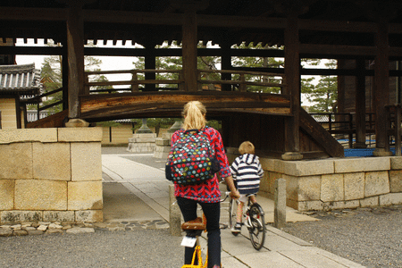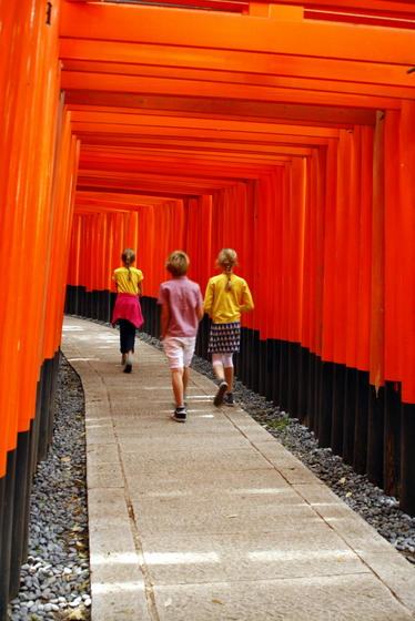 On bike ride around Kyoto.  Many temples/shrines were visited, many kilometres were cycled.  And there was only one small accident involving Chloe (surprise) and a pile of garbage bags.At the entrance to Fushimi Inari Shrine.  The colours were so vibrant.Four kilometer walk up the mountain under thousands of red gates (at Fushimi Inari).  On the way back down the path.Cherry blossom bee.Very old door at Nijo Castle.A visit to the world famous Zen Garden of Ryonji.