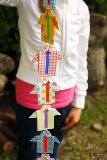 These origami garlands are so sweet and my kids were the ones who actually folded the shirts (even my little guy). Origami has become very popular in our home and I’m so glad I brought back that suitcase FULL of origami paper from Japan (despite comments such as “are you sure we need 30 packages of origami paper?”).I sewed the little shirts together before glueing on the ties and bow ties. You can make these shirts any size you want. My kids have made tiny tiny versions and almost life size versions. When we’re in restaurants they even fold the cloth napkins into these little shirts. It takes under a minute to fold one so you can make loads in a short amount of time.