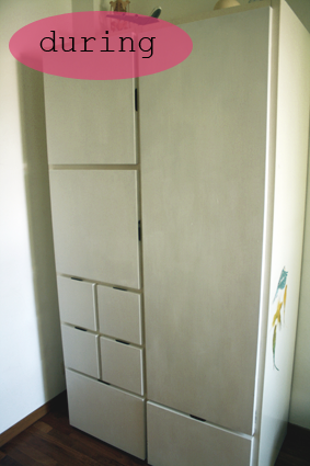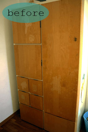 A while back I received this old sticker-covered cupboard from a friend who was getting rid of it.  It took me three hours to get the hundreds of stickers off the cupboard doors (my fingertips were raw and bloody by the end). After the de-stickering I gave it a few coats of white paint.