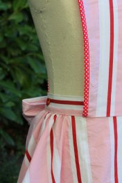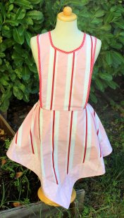 So my sewing group and I decided we’d kick off the year by making one of the vintage aprons. We thought it would be a quick and easy starter project. We decided on the pattern with the handkerchief skirt (bottom row, 2nd from left, red and white apron). In the end it wasn’t a one morning project. With all the bias and fancy edgings etc it took a lot more time than we thought.