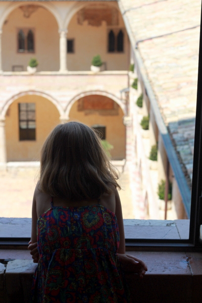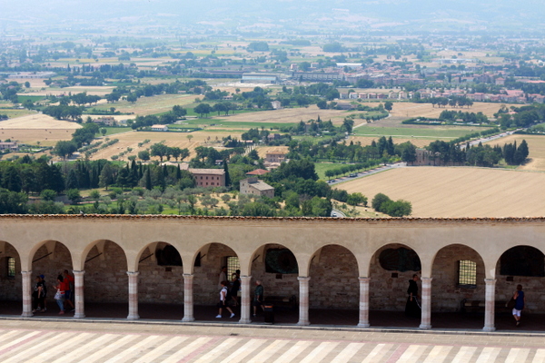 IMG_9927Walking through the narrow cobblestone streets of Assisi you run into nuns,priests and monks visiting from all over the world.  We were all quite impressed with the emotion a lot of people felt as they visited Assisi.  There were people in tears, in deep prayer and in awe of actually visiting a place that obviously meant so much to them spiritually.IMG_9938In addition to the impressive architecture to be found throughout the small town there are also stunning views over the Umbrian landscape to admire.  IMG_9936Sneaking a peek at the priests in the lower courtyard.  As you walk through the basilica grounds there are priests stationed around to talk to visitors (an experimental initiative by the church). We had a lovely chat with a Venetian priest (in training) about his experiences in Assisi and his background which involved a PhD in mathematics.  He was open and friendly and open to questions of any sort.