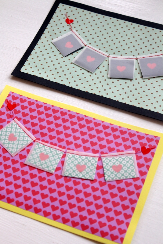 I cut the glassine paper in long strips and folded it in half to have a square piece of paper.  I then sewed the pieces of glassine squares together with the sewing machine (making sure the folded edge is on the bottom).  This way the glassine paper is sewn on the top, closed by the fold on the bottom and open on the two sides (to make it easier to slip in the small pieces of paper with message on the back).IMG_4068After sewing the bunting together we slipped in little square pieces of paper with our special messages on the back.  Seeing as the glassine is open on both sides the messages are easy to slip in and out.  We then simply attached the sewn paper bunting to our cards with tiny heart stickers (pieces of washi would also be nice).