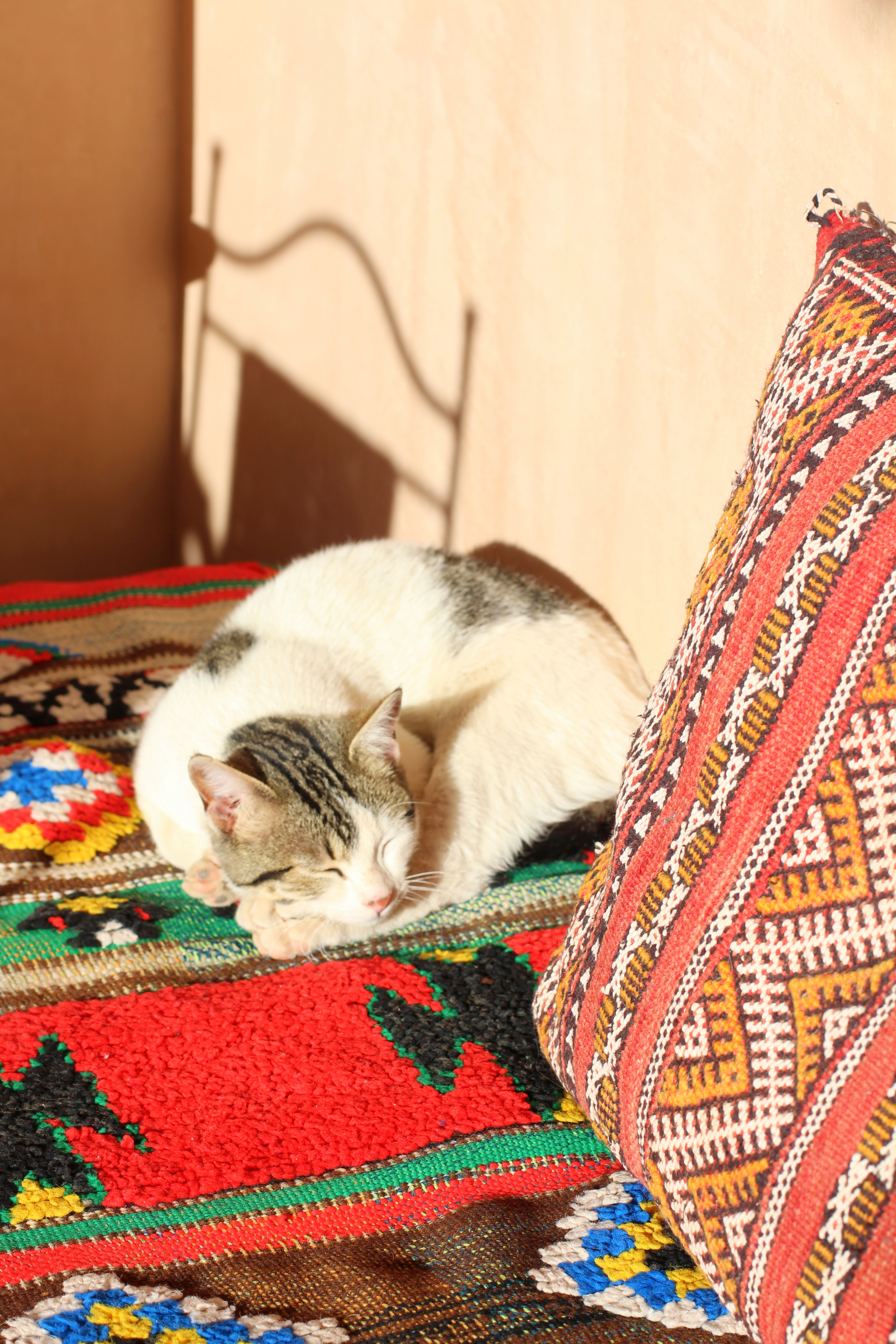 Our favourite Moroccan cat sleeping on the outdoor terrace of our favourite Moroccan guesthouse.