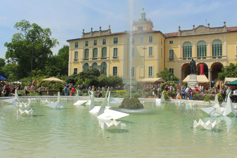 …huge origami cranes and lilly pads in a lovely fountain in front of an even lovelier old villa.