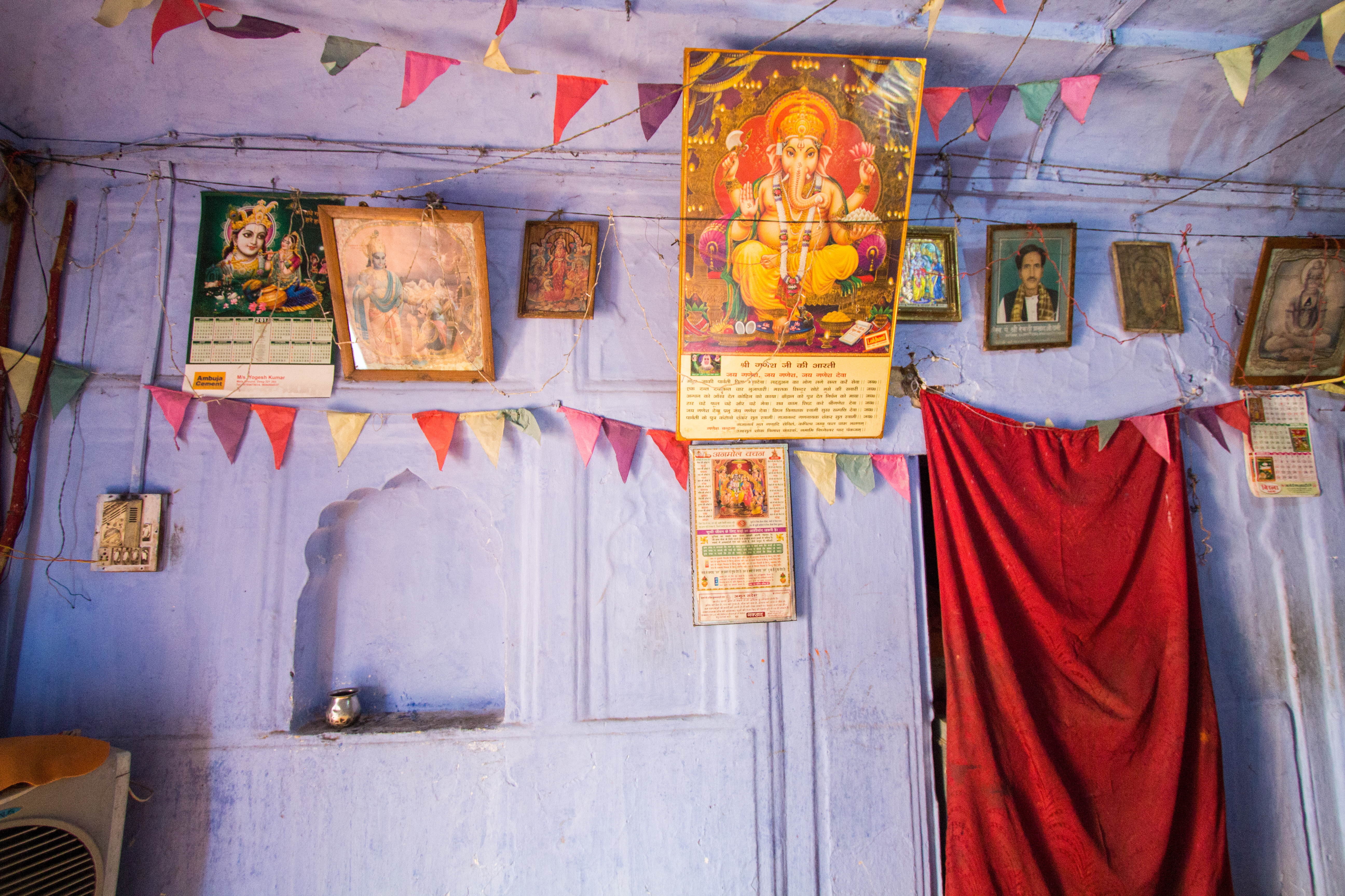 A tiny temple dedicated to Hanuman, the monkey god.  The colours, the garlands, the posters, the man handing out milk sweets.  Perfection.  (Deeg Palace)