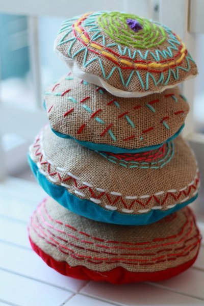 Using burlap to teach kids embroidery is ideal because it’s so easy to get the needle and thread/yarn through the largely woven fabric and even possible to reverse if a mistake is made. And the contrast of the earthy textured brown material with brightly coloured thread is absolutely lovely. One little piece of advice would be to always zigzag the edges of the burlap beforehand to reduce fraying.