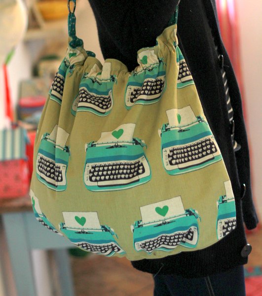 We decided to sew the Scrunchie Bag (page166) because it’s a big and roomy casual purse that we thought would come in quite handy. I decided to use a gorgeous fabric with vintage typewriters on it by the Japanese brand Kokka (Melody Miller’s Ruby Star Shining). For the inside of the bag I used a spotted linen that I purchased in Japan last year. The two fabrics compliment each other perfectly.