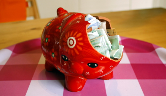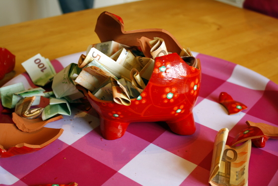 So over the months we would put in 5 euro here, 20 euro there. A few times we put in bigger amounts as well (Christmas gifts from family etc). The kids even put in the odd euro coin when they had it as well. In the end that pig became a small part of our daily routine..get home from busy day, put down purse, dump any extra change or bills into pig.
