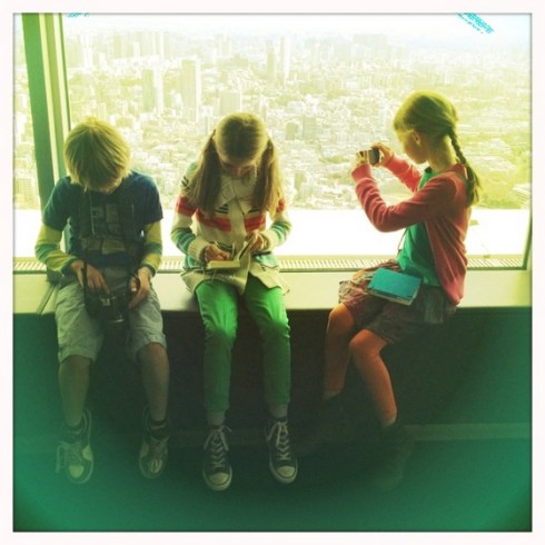 Busy kids and the Tokyo skyline.